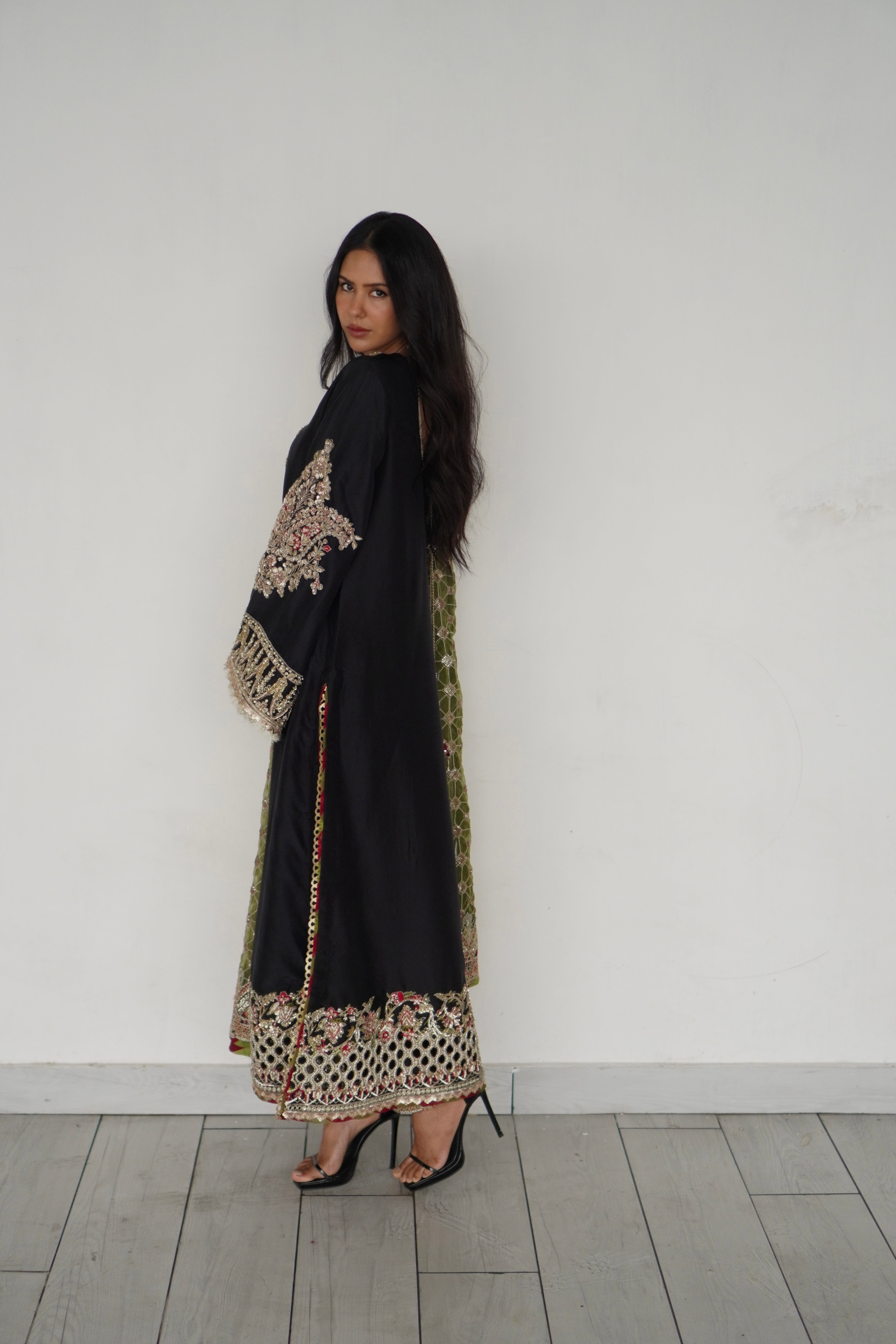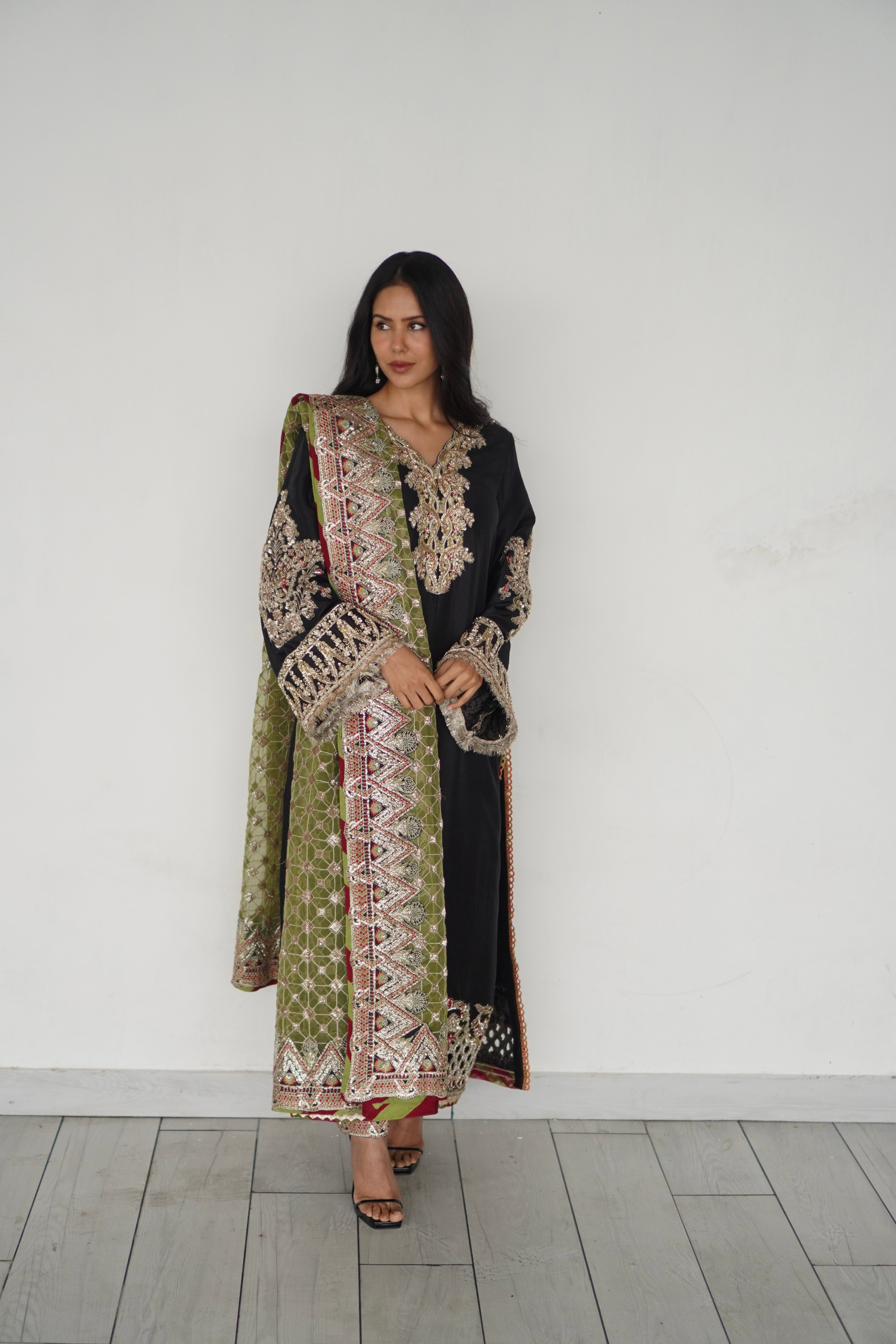 Dazzling like a shooting star in a dark night, sonam outshines in this black pure rawsilk formal attire with breathtaking intricate zari details paired with an olive organza heavily embroidered duppata adds that extra dash of poise and grace .