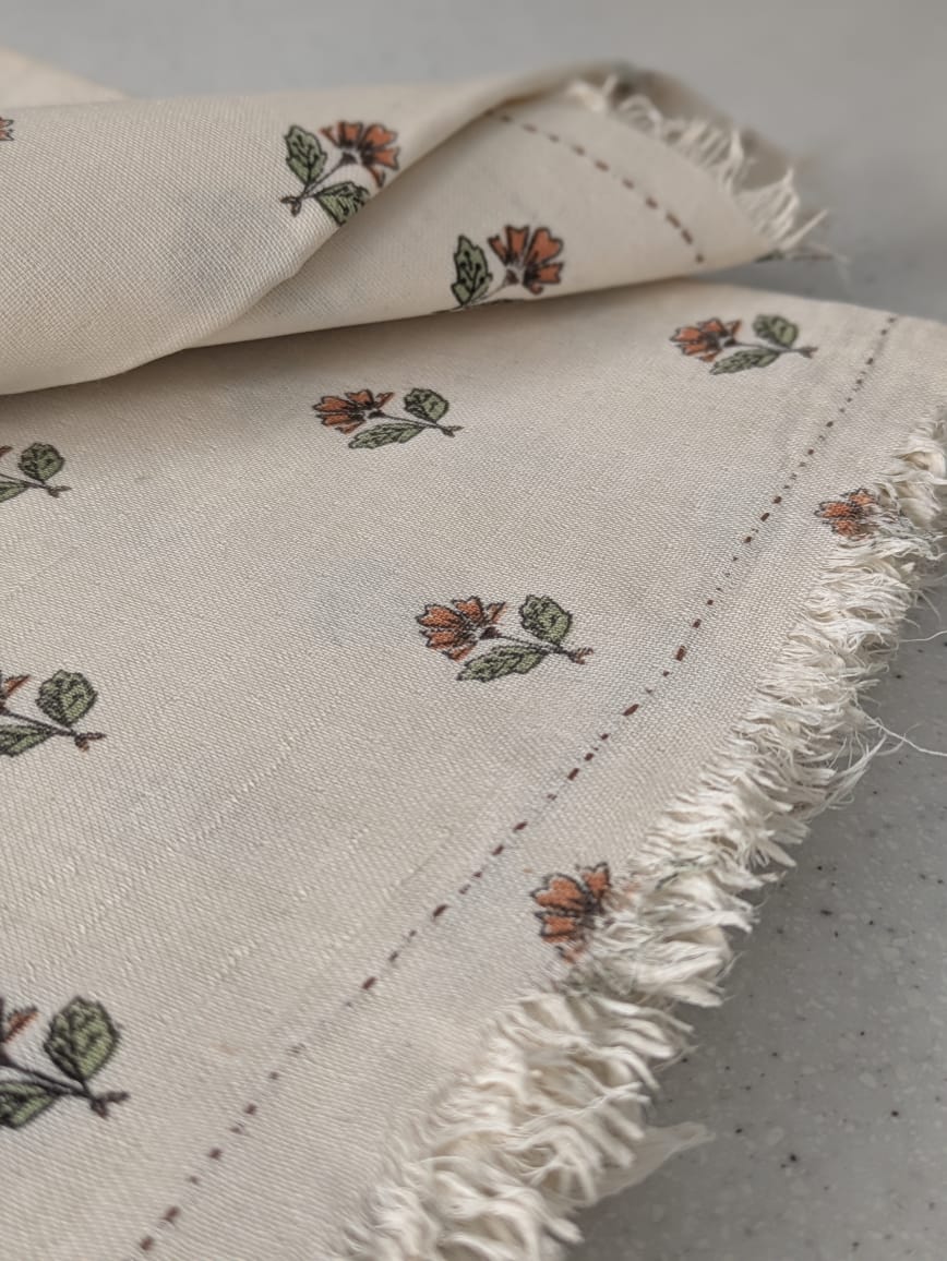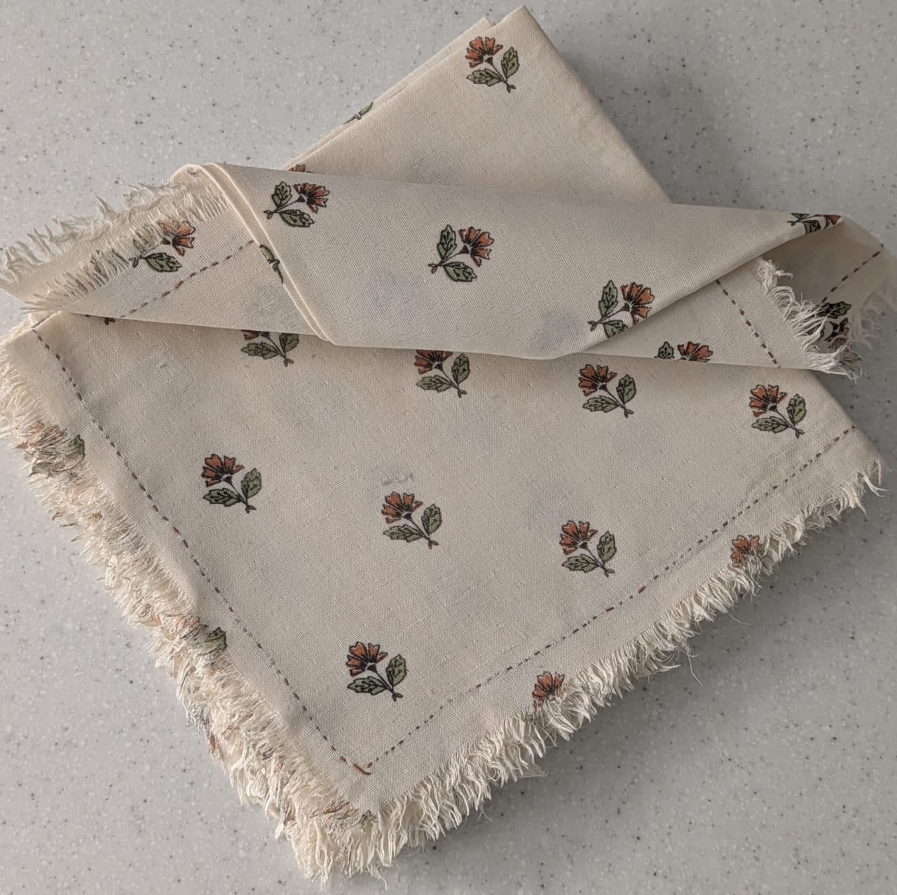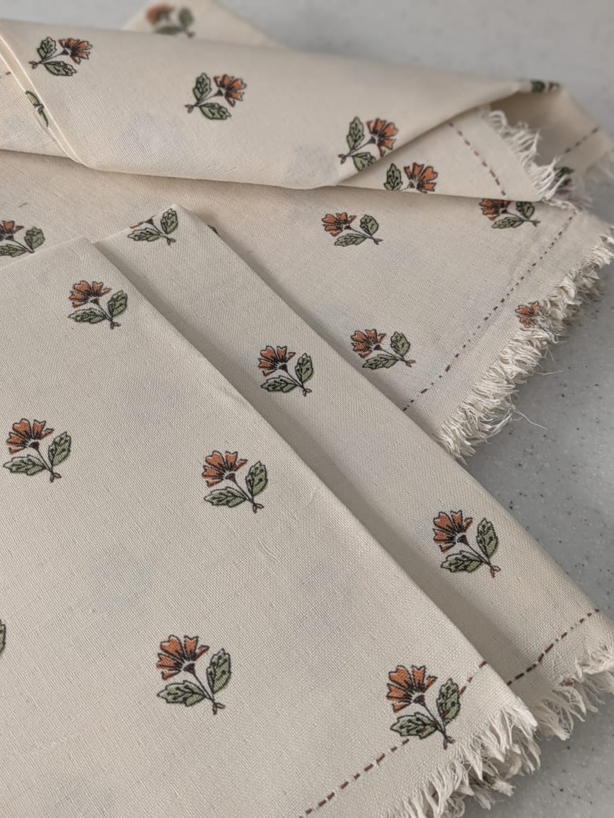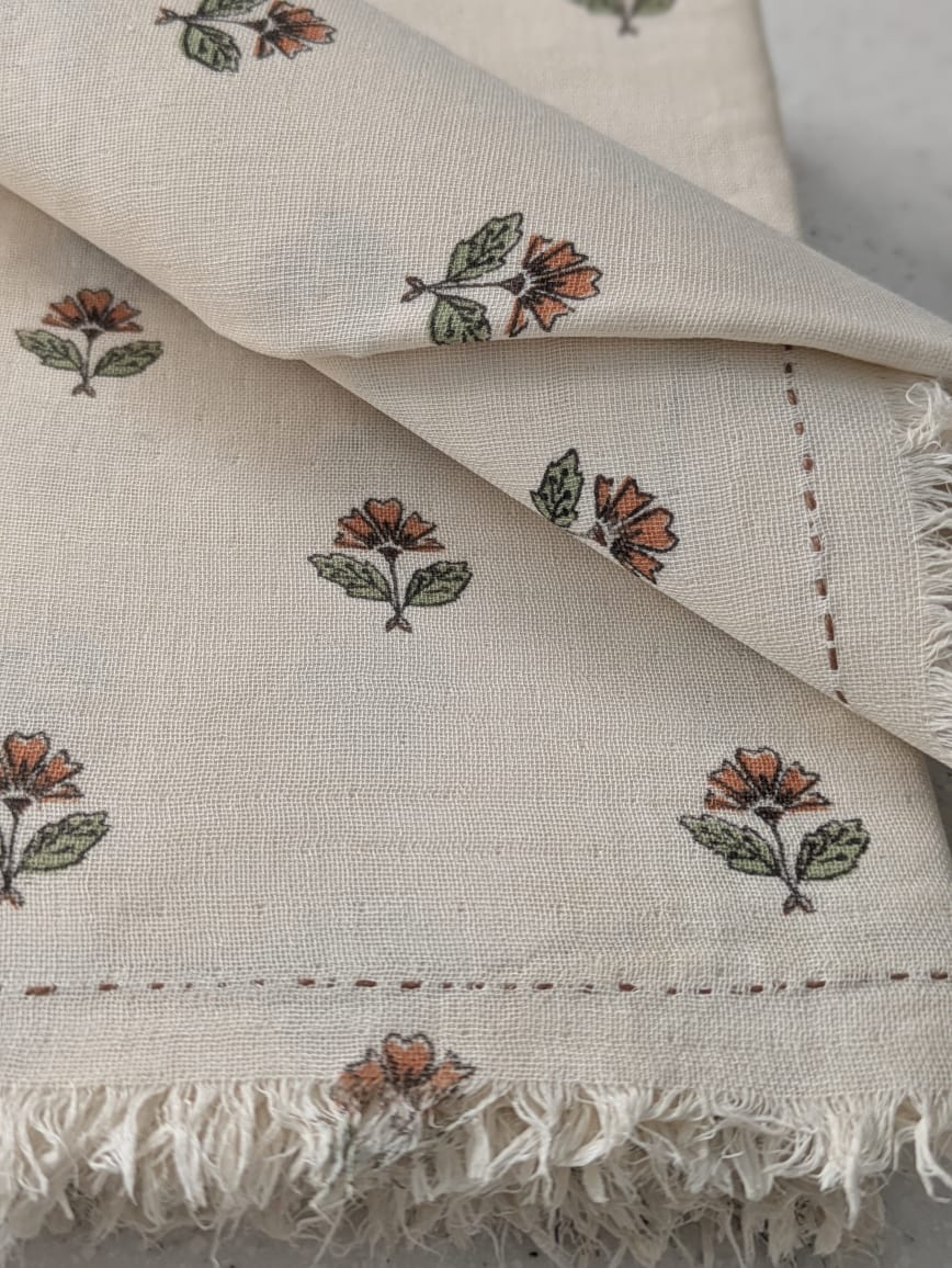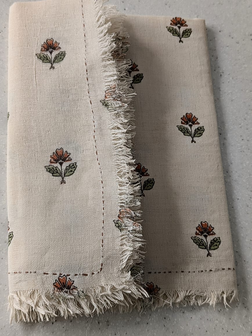 Traditional design dinner napkins in subtle hues ,an elegant ivory base paired with burnt orange and olive green creates a perfectly balanced colour palette. The delicate block printed motifs enhance the beauty of the napkins, while the handcrafted brown thread edging adds a refined, traditional finish.