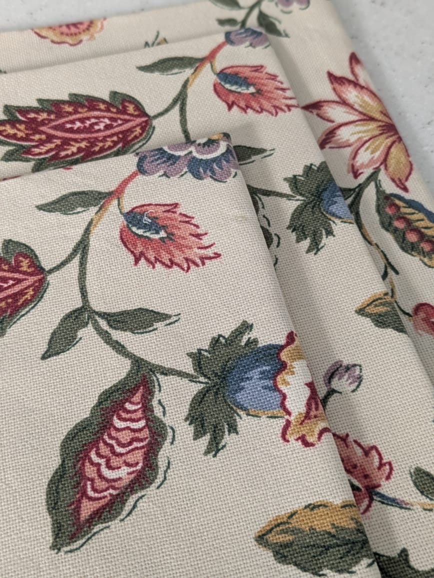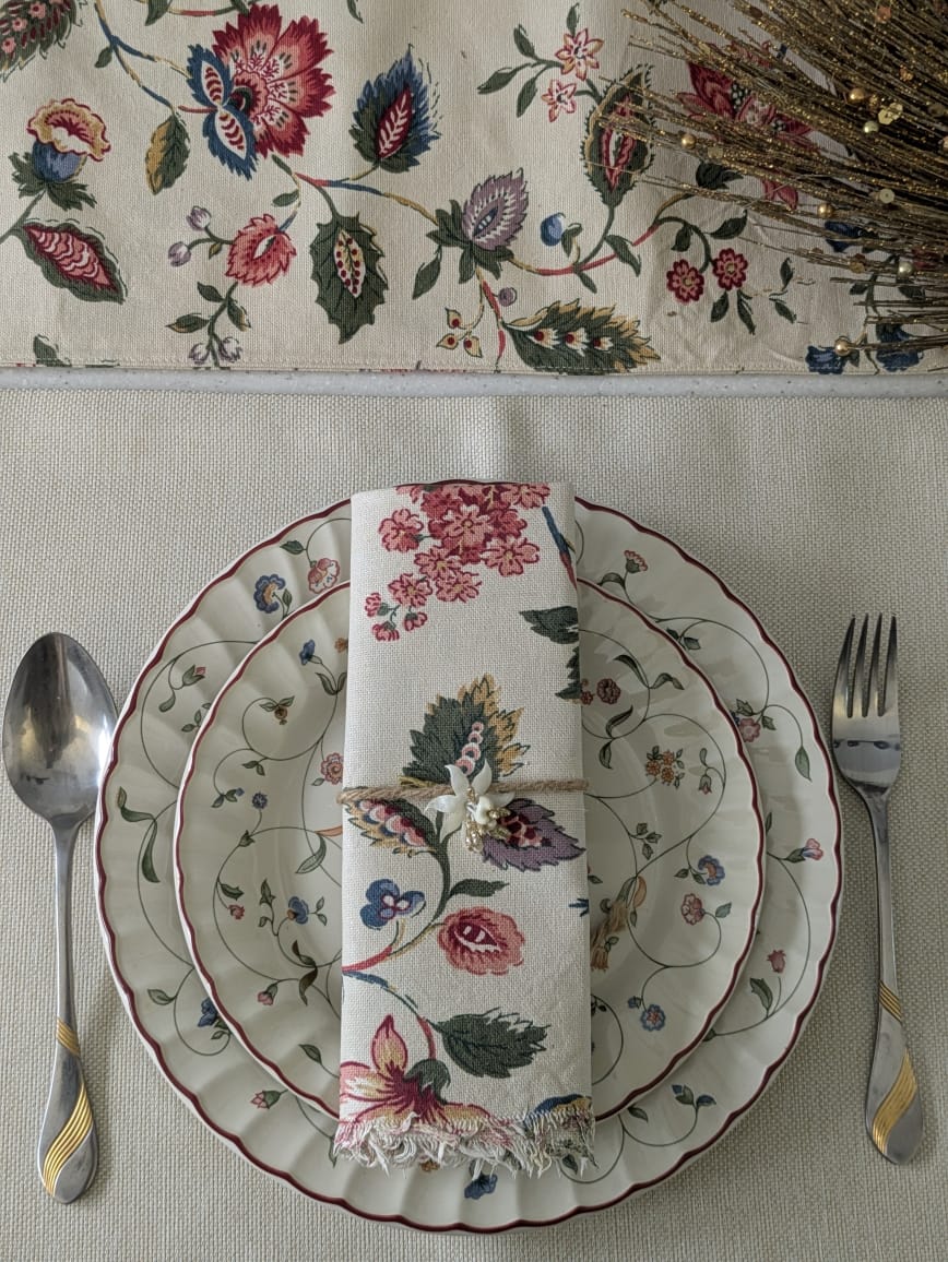 Bringing your table to life, this ivory base adorned with beautiful floral designs in deep maroon and olive green adds romance and style. The plain beige placemats break the monotony, creating a perfect balance. Your friends are sure to love the evening and make it truly memorable.