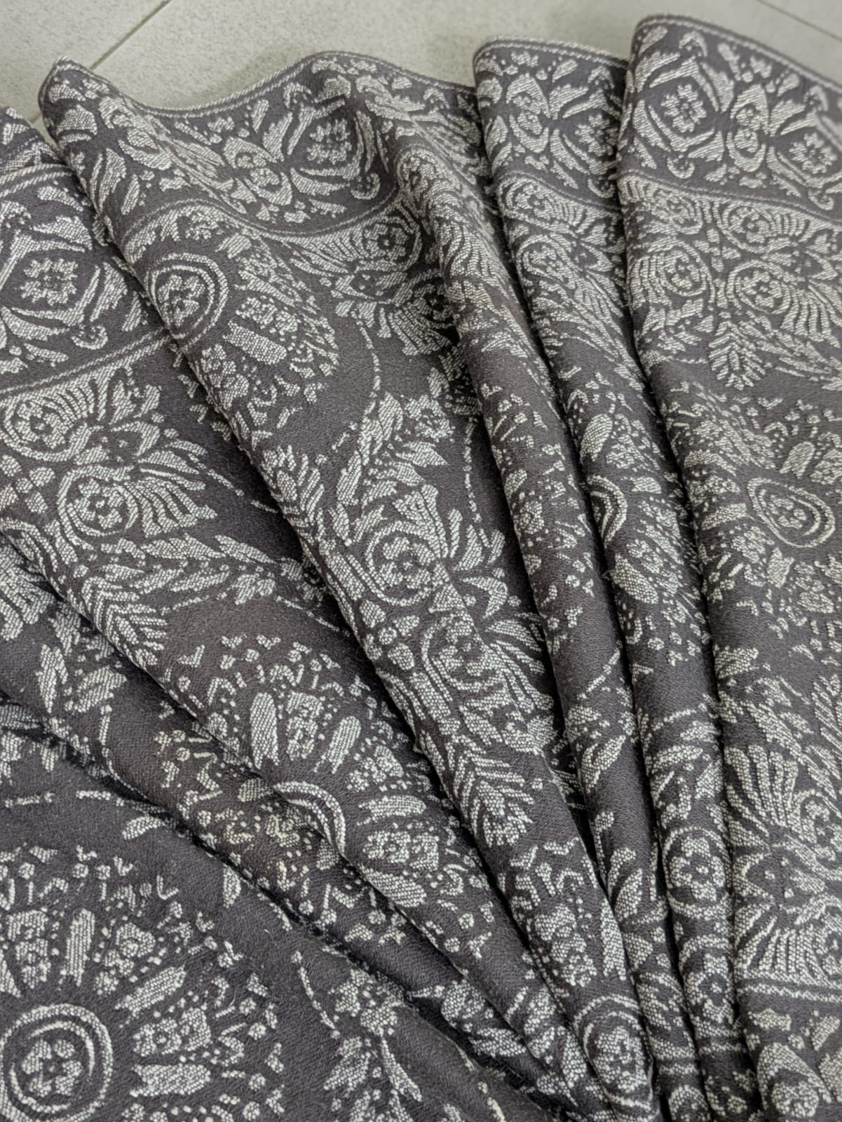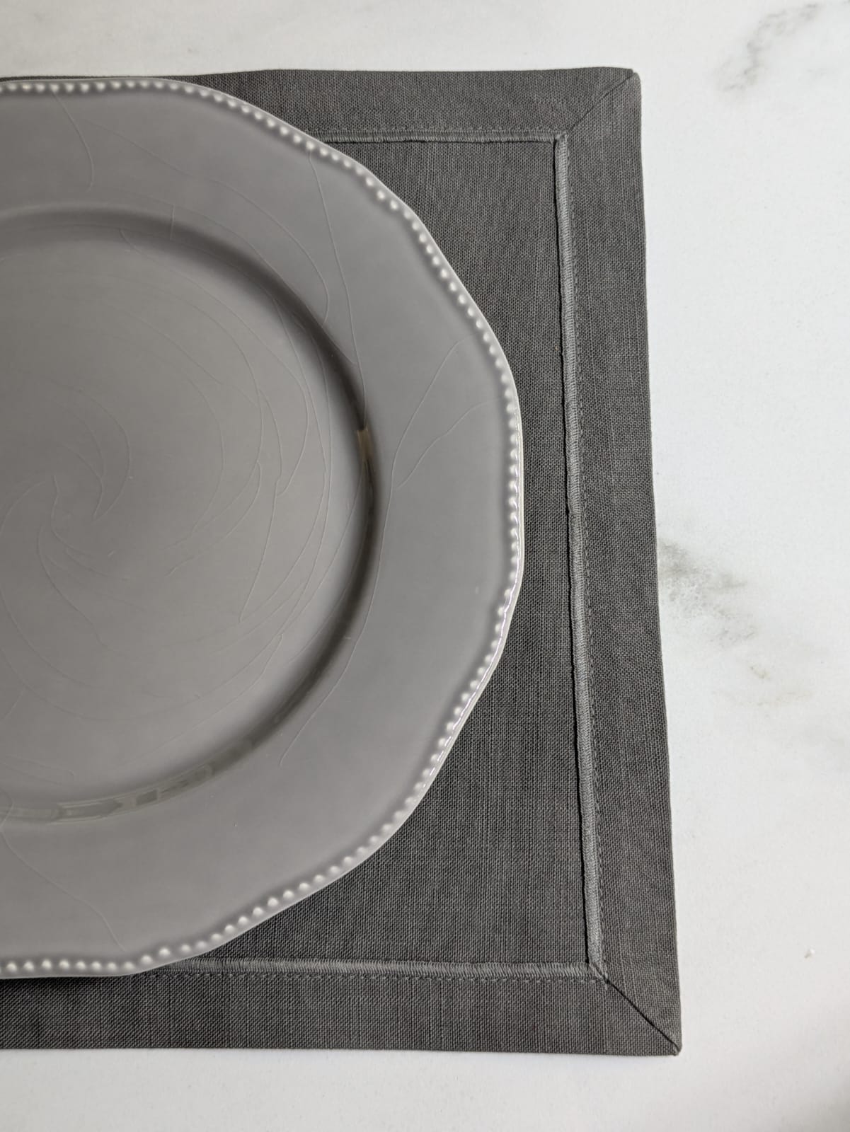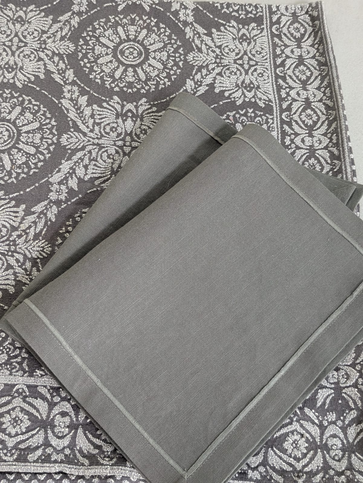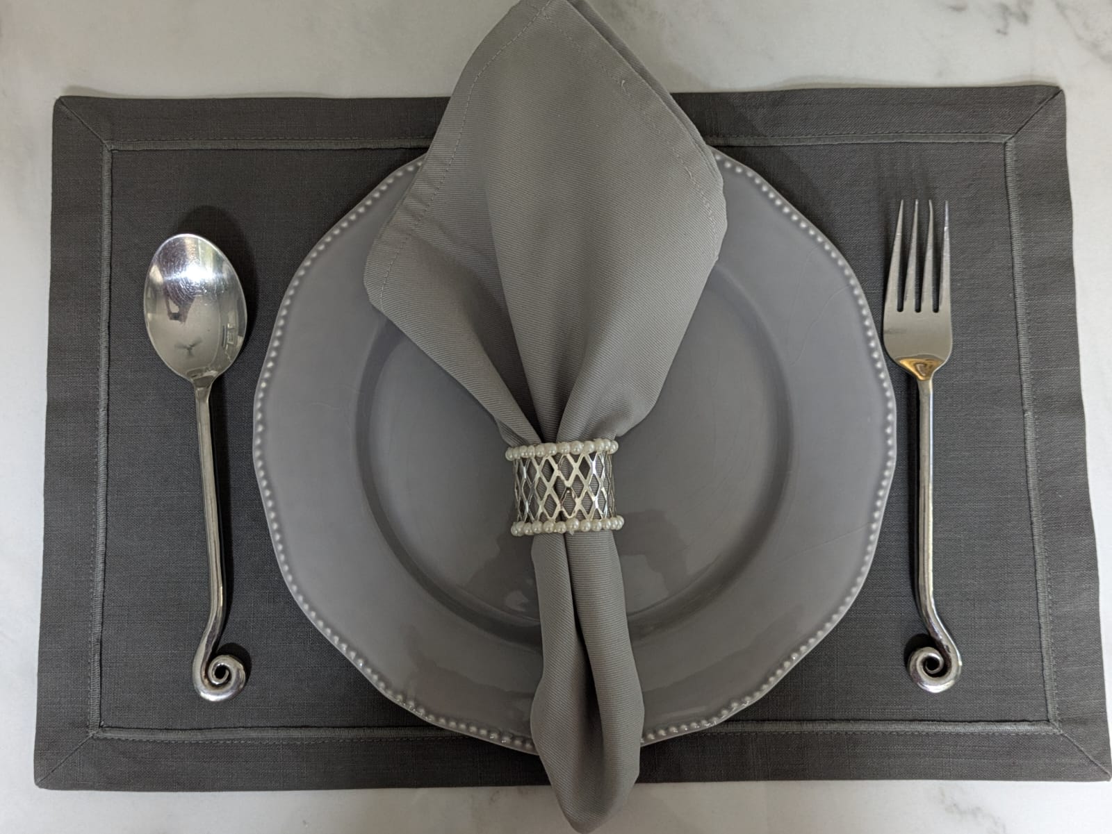 It’s time for a touch of grey elegance. An off white and grey runner with intricate detailing that pairs beautifully with plain grey placemats. Add ivory crockery, and you have the perfect classic, refined setting for a cozy meal with friends.