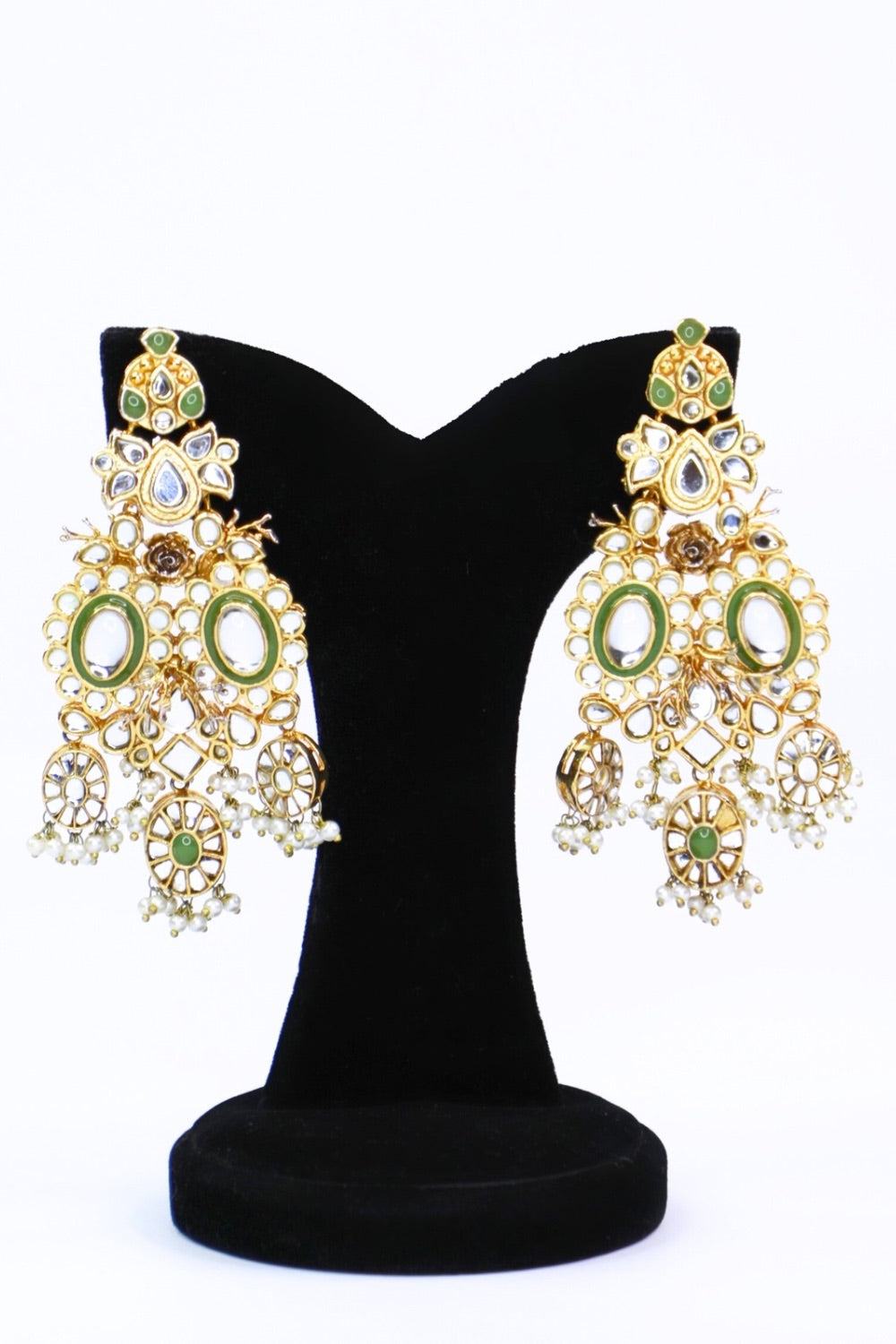 Gold-plated necklace adorned with kundan details, mint-colored rough stones, and lustrous pearls for a refined, elegant look.
