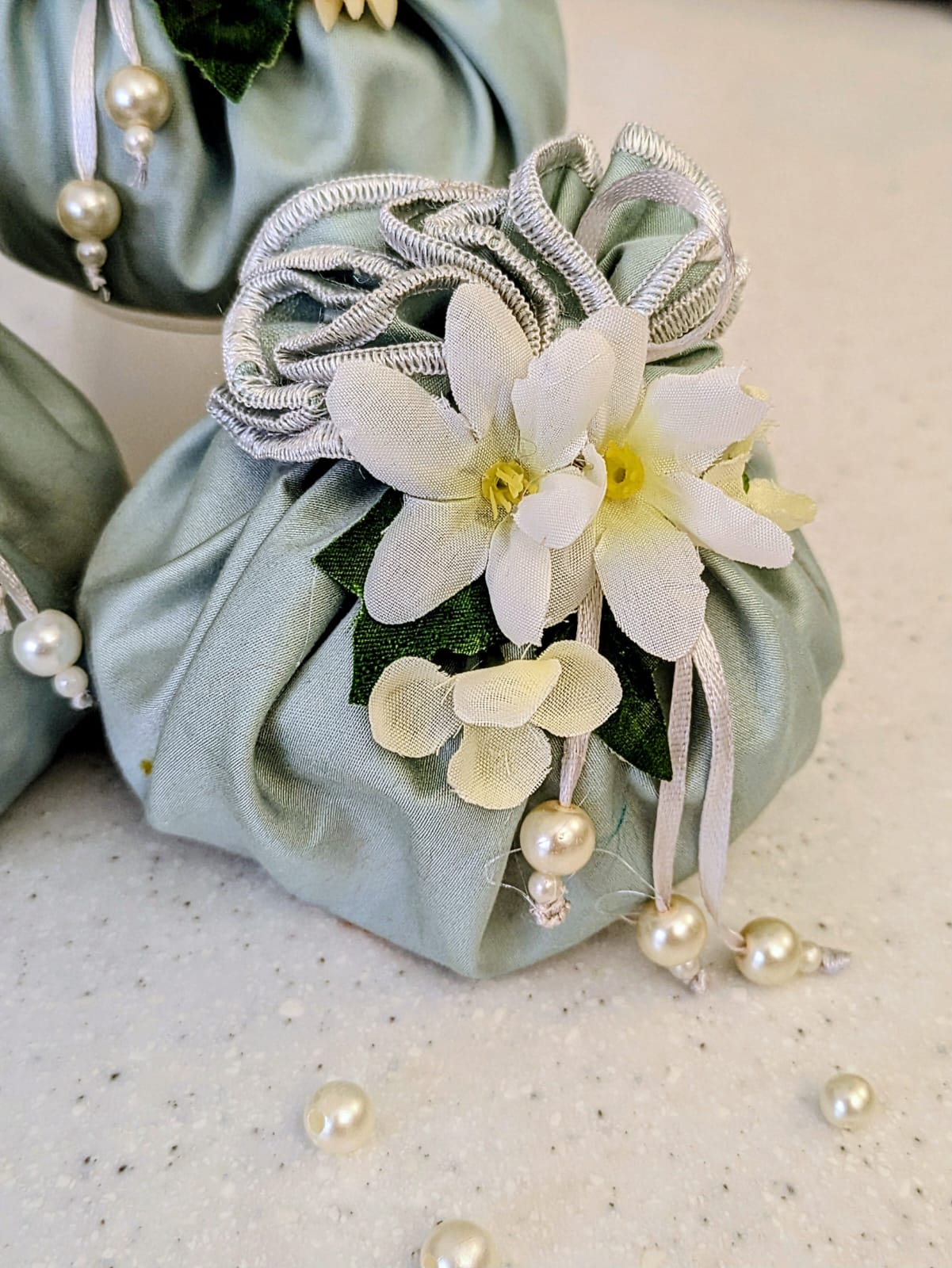 Mint green pouches edged in off-white create a subtle, elegant, and timeless look. Perfect for Nikkah announcements or thoughtful giveaways, each piece becomes even more special with delicate floral accents. Make your celebrations truly memorable.
