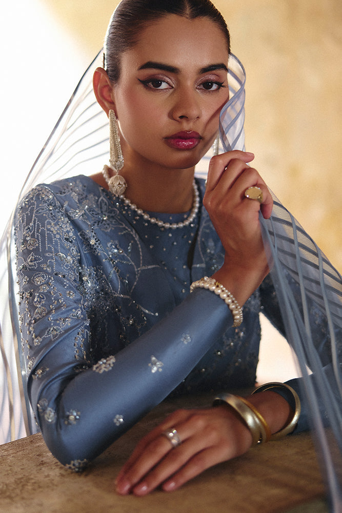 - Net dupatta with knife pleats, metal strips, and cascading tassels