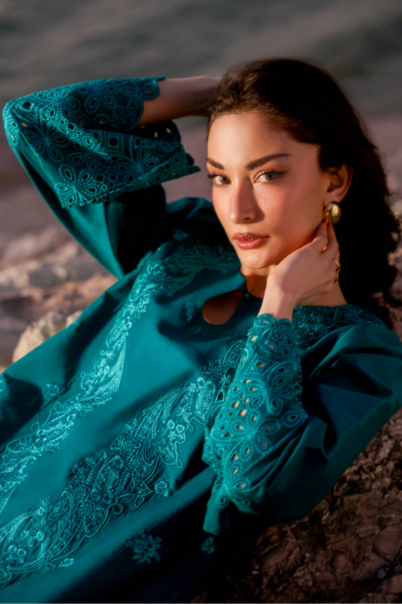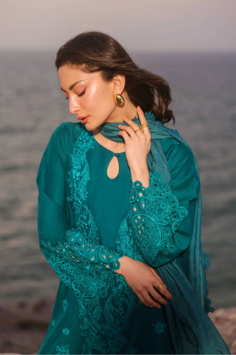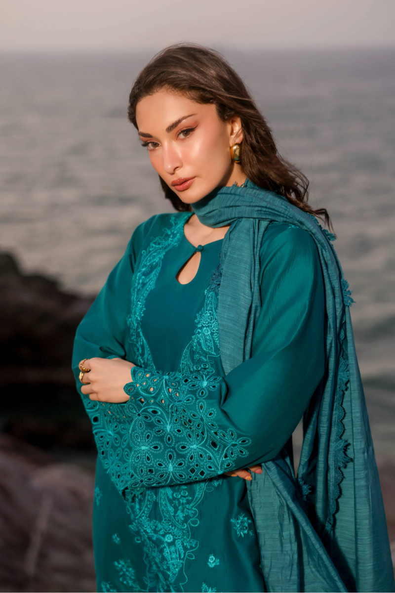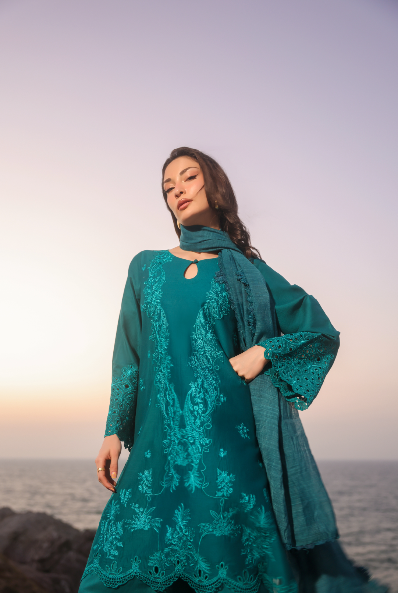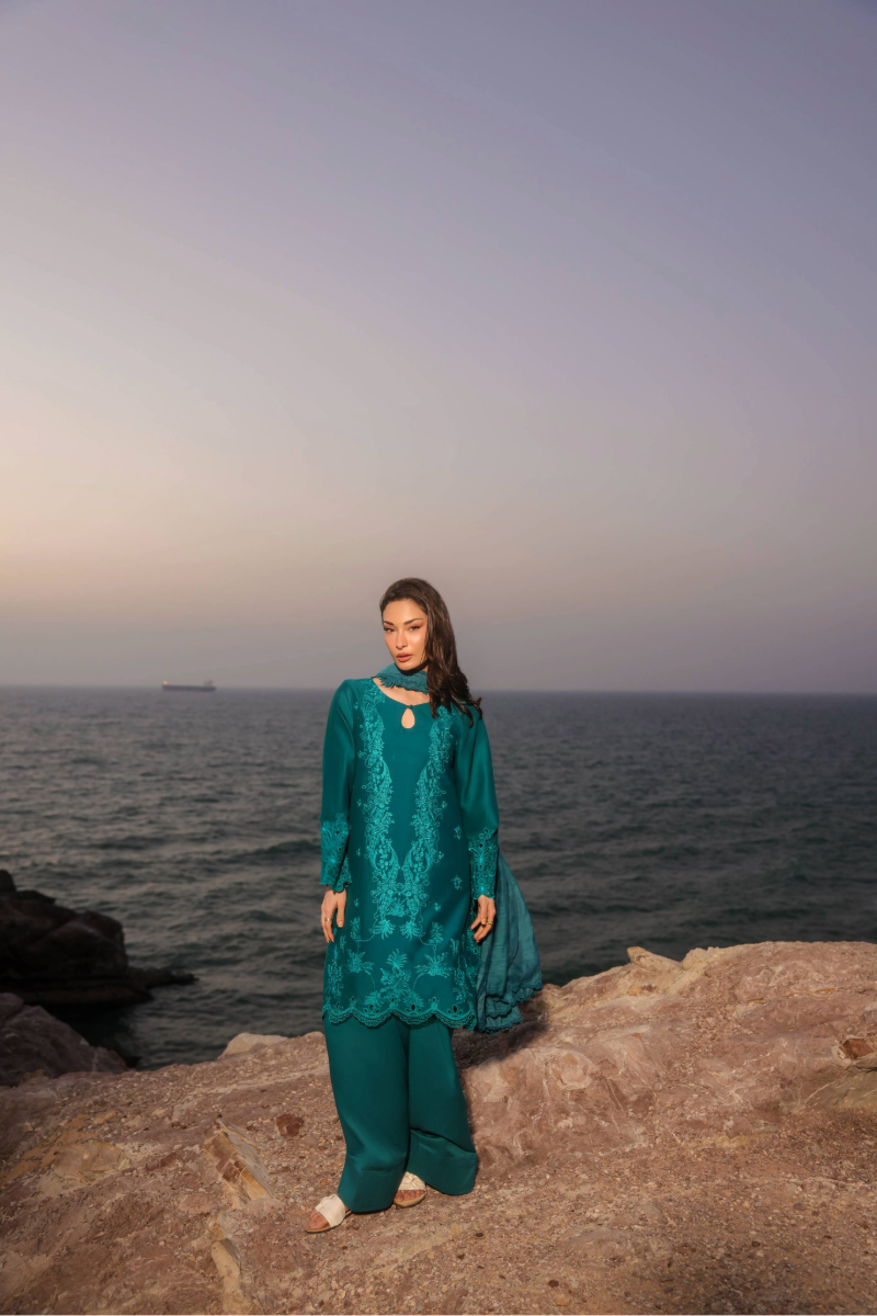 Zinnia is a chic solid zinc green ensemble crafted for effortless elegance. The short shirt showcases monotone embroidery, finished with a scalloped-edged hem and chunky cutwork borders on the sleeves. It is paired with a farshi shalwar and a solid dupatta edged with lace, making it perfect for a refined summer look.