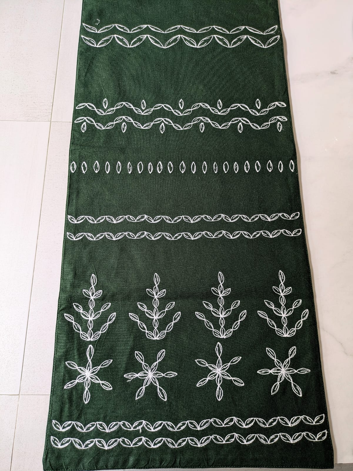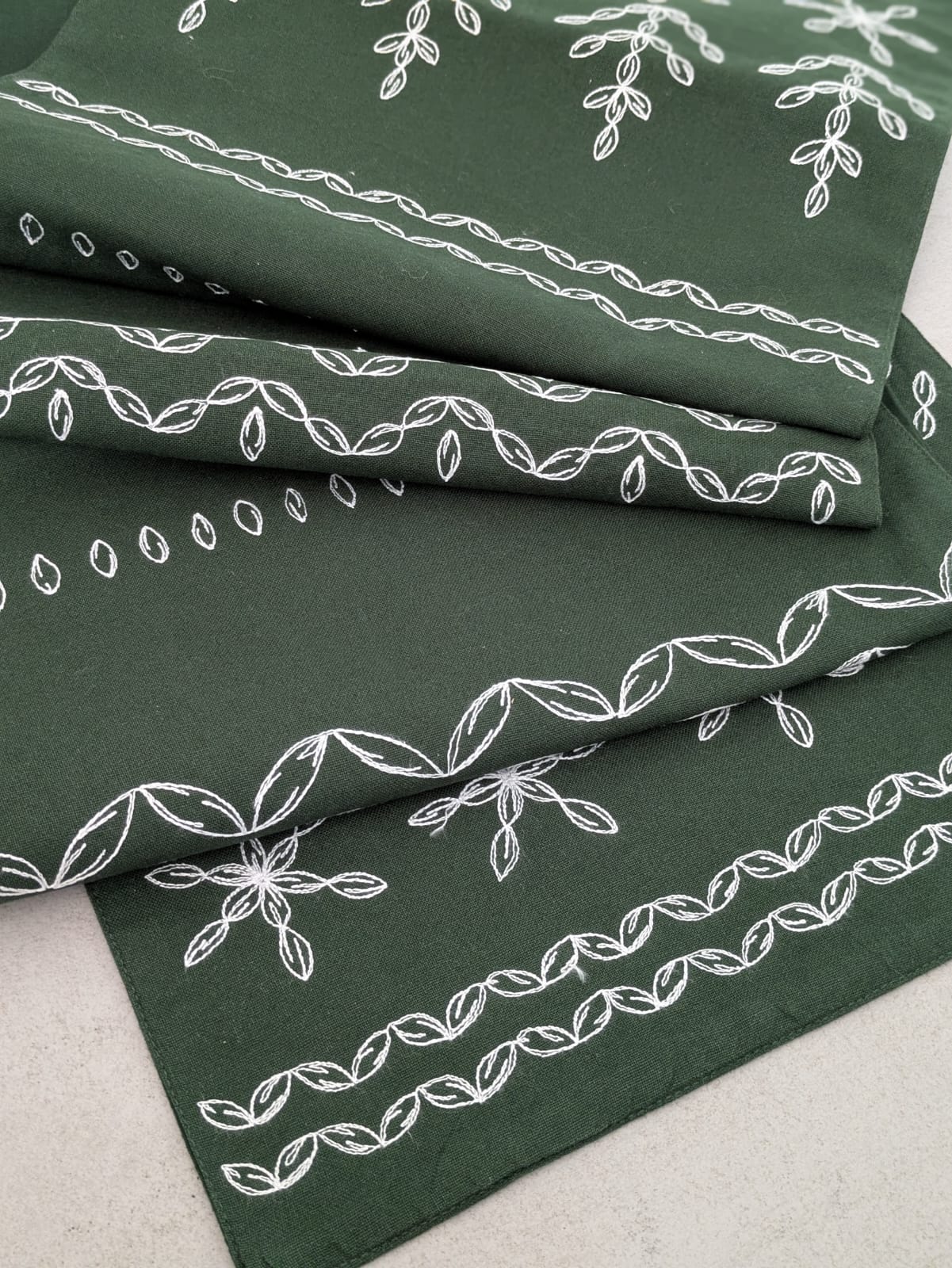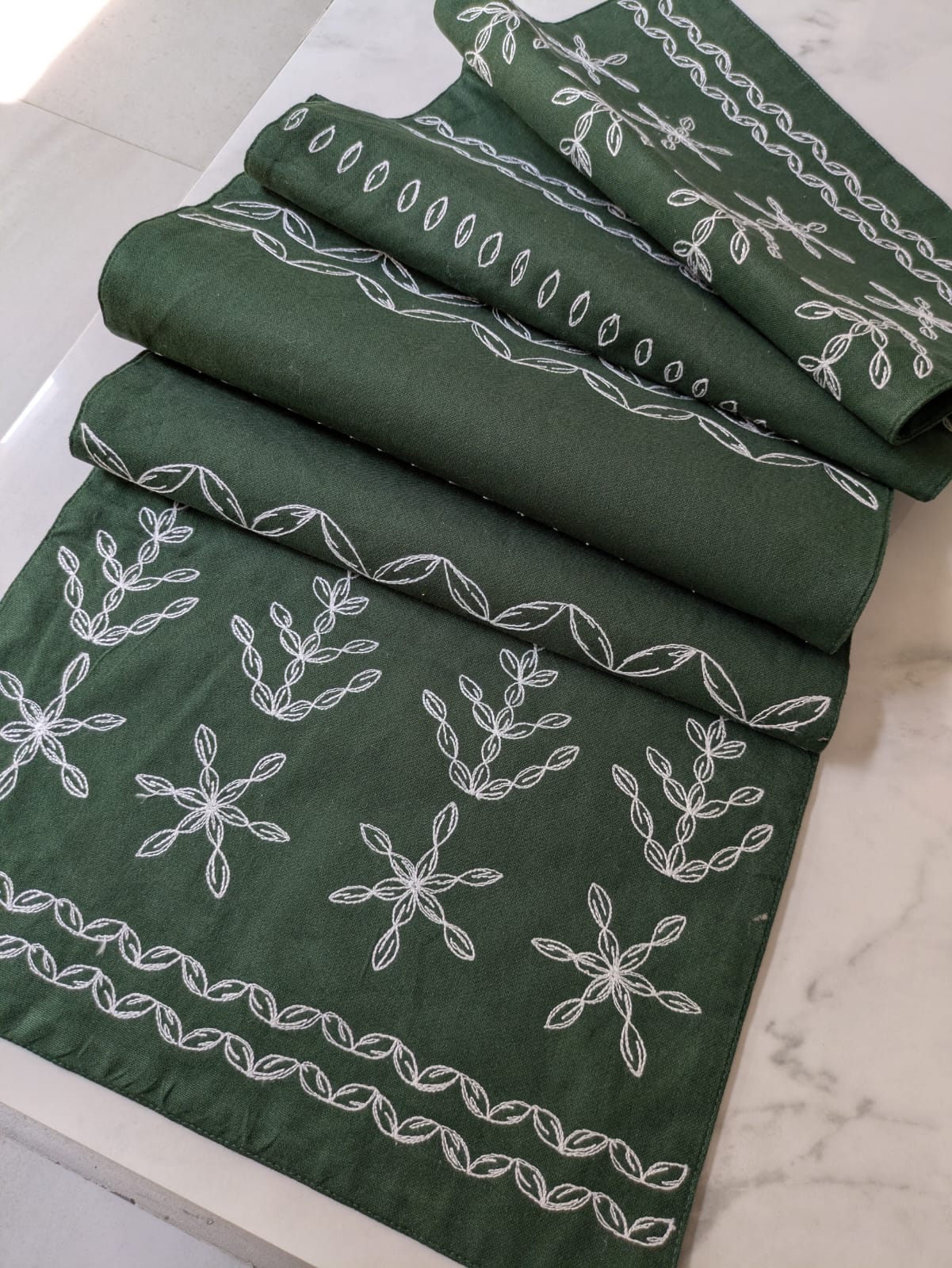 Bottle green base adorned with fine, intricate white embroidery .A timeless colour pairing that brings richness and warmth to your dinner table. Elegant, stylish, and the perfect touch for a memorable tablescape.