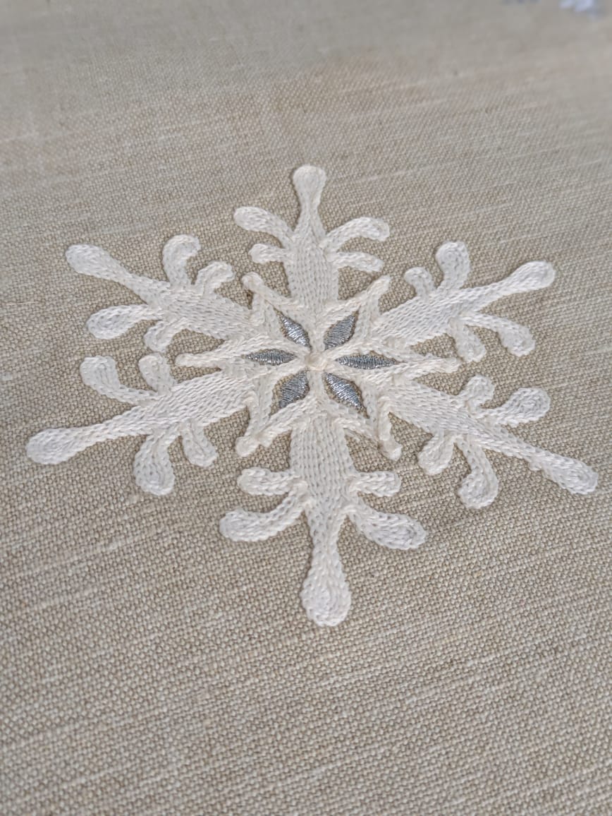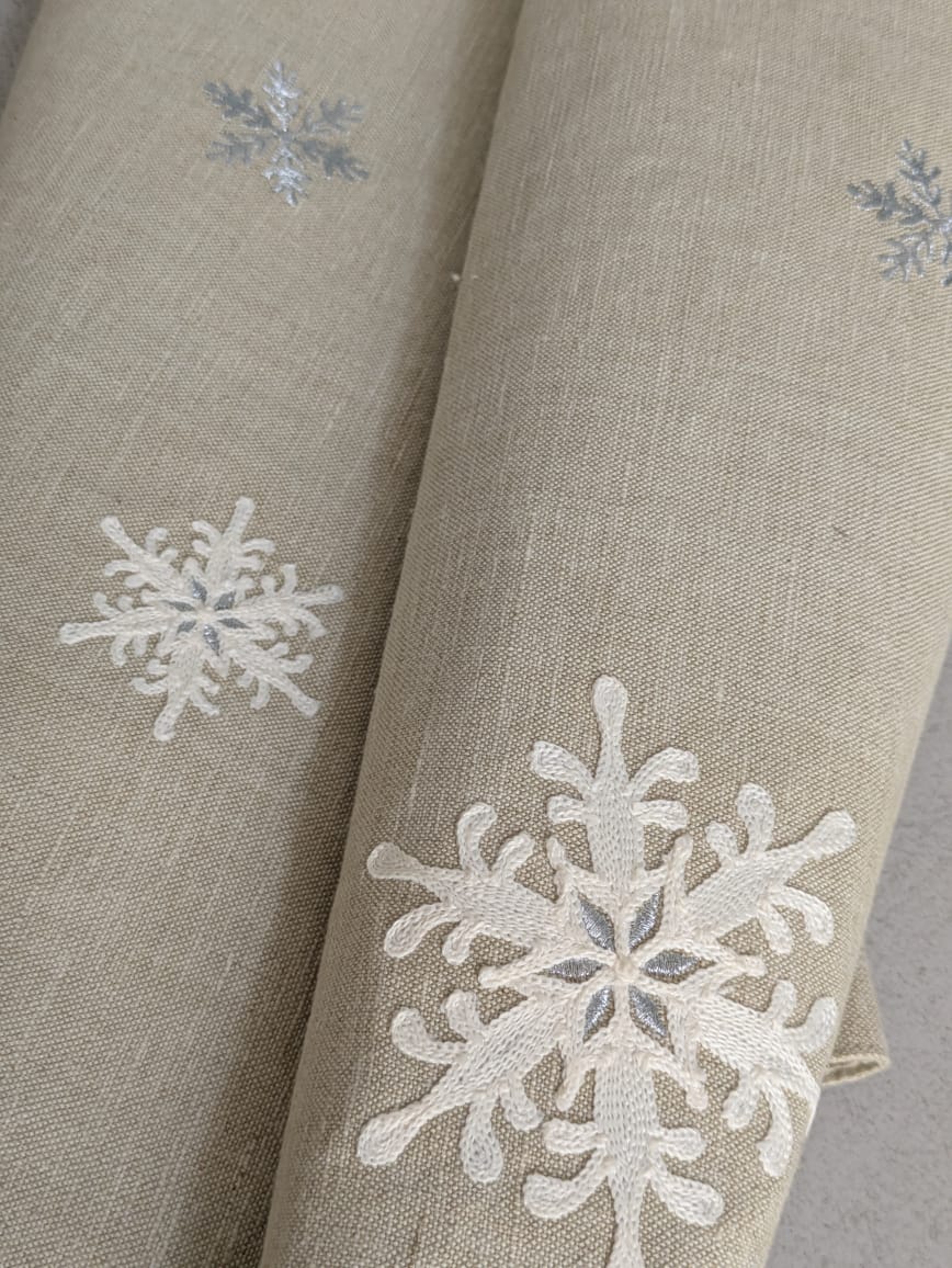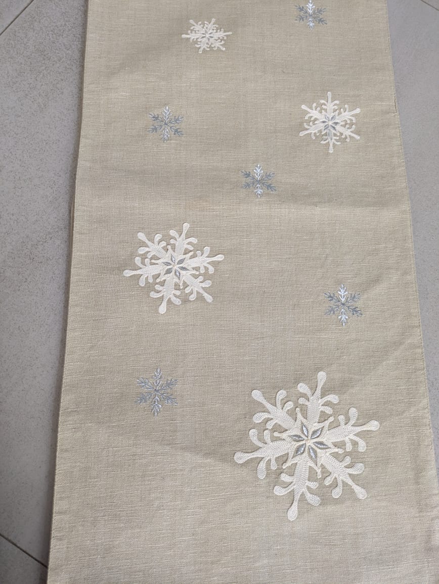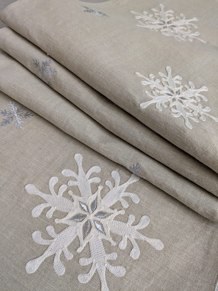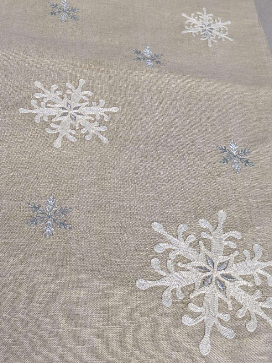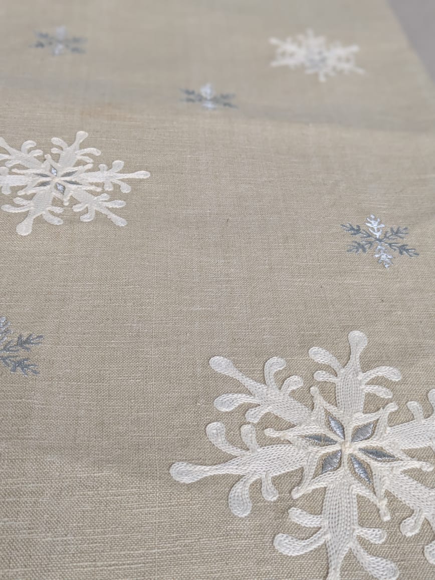 A beige table runner beautifully adorned with ivory and silver embroidery. The unique floral motif feels fresh and graceful, adding a refined elegance to your table. Pair it with ivory dinner napkins to elevate the setting, and finish with a fresh floral arrangement for the perfect final touch. Now all that’s left is to invite your friends and create a memorable gathering