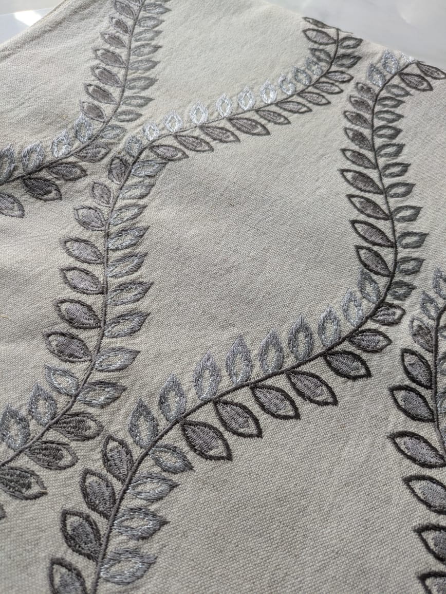 A beige base adorned with shades of grey and silver embroidery, this fully embroidered table runner showcases an intriguing pattern. The delicately crafted leaves are finished to perfection, adding depth and elegance, and bringing a refined touch that instantly livens up your space.