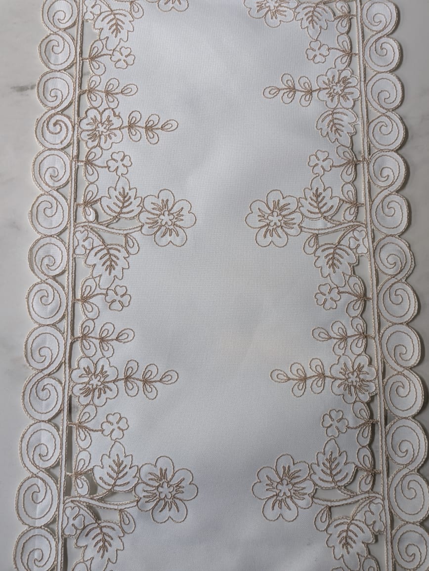 An ivory table runner adorned with light brown dori embroidery, fully embroidered with detailed edging. Rich in design yet beautifully understated, it adds a modern and inviting touch to your table styling perfect for dressing up your table this Eid.