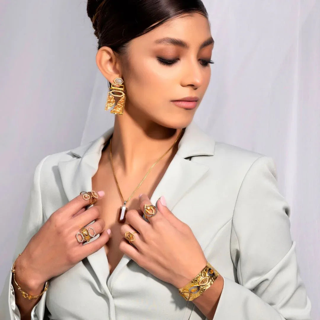 Gold-plated ring, adorned with white and coffee coloured zircons.