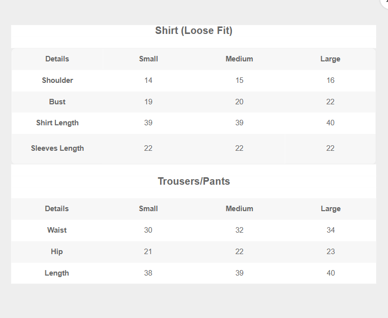 Size charts available in images/ swipe / scroll to the last image to view the size chart.
