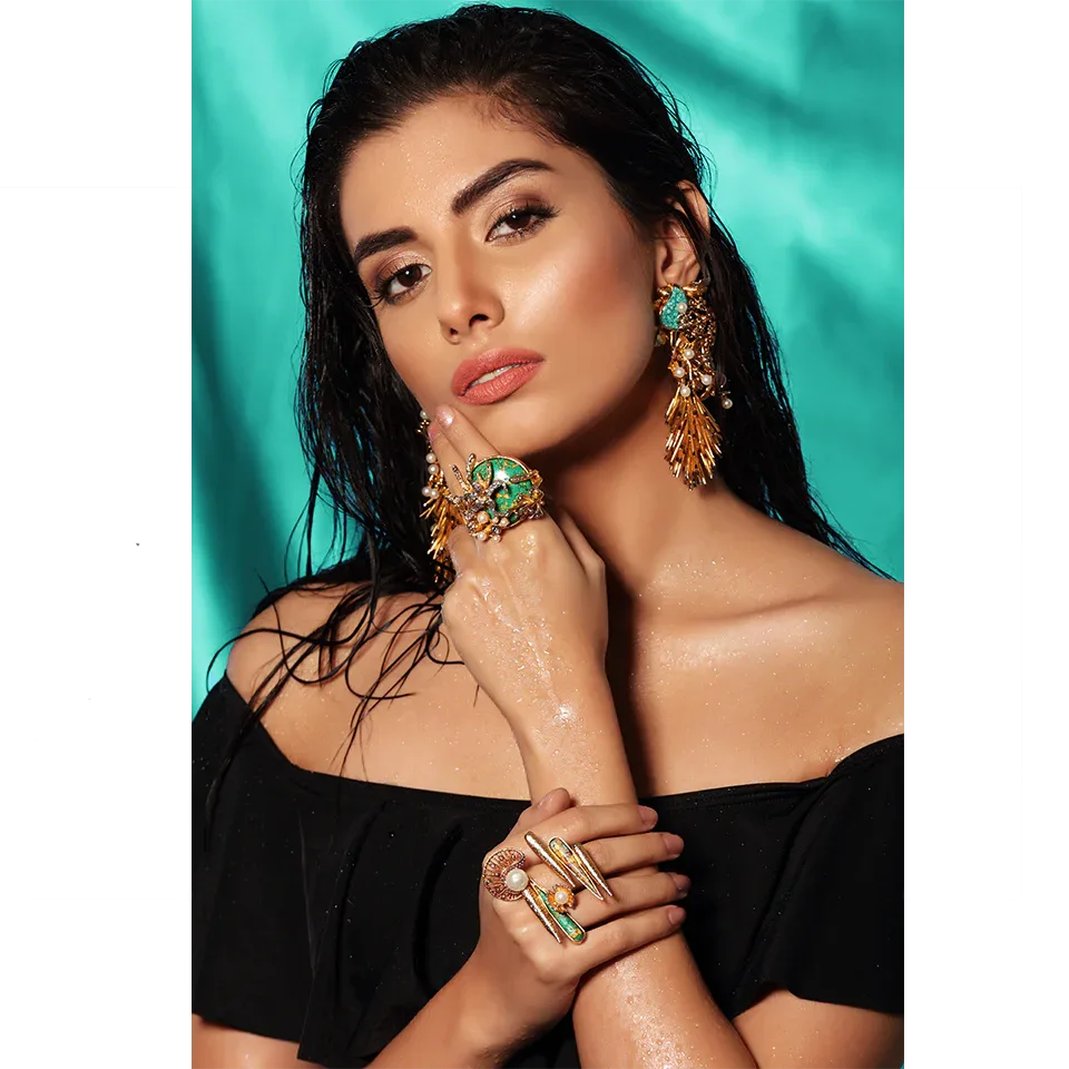 Earrings with gold-plating and rhodium touches, embellished with rough feroza stone and zircons.