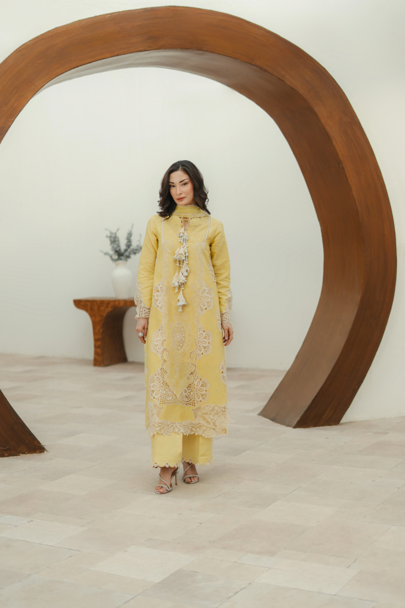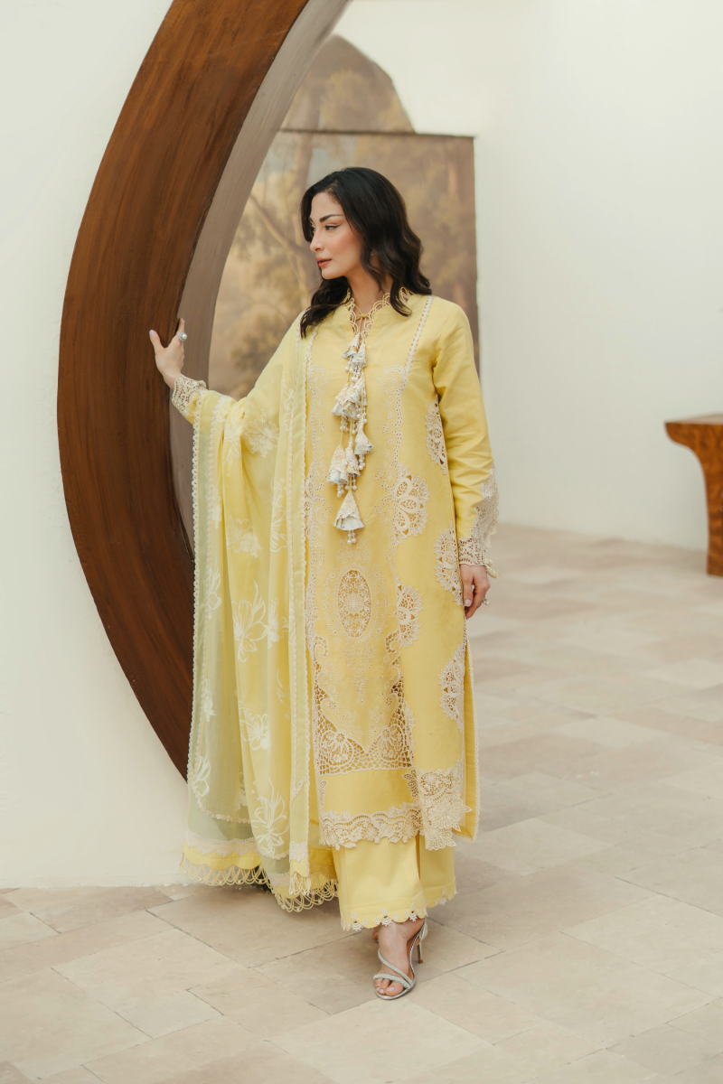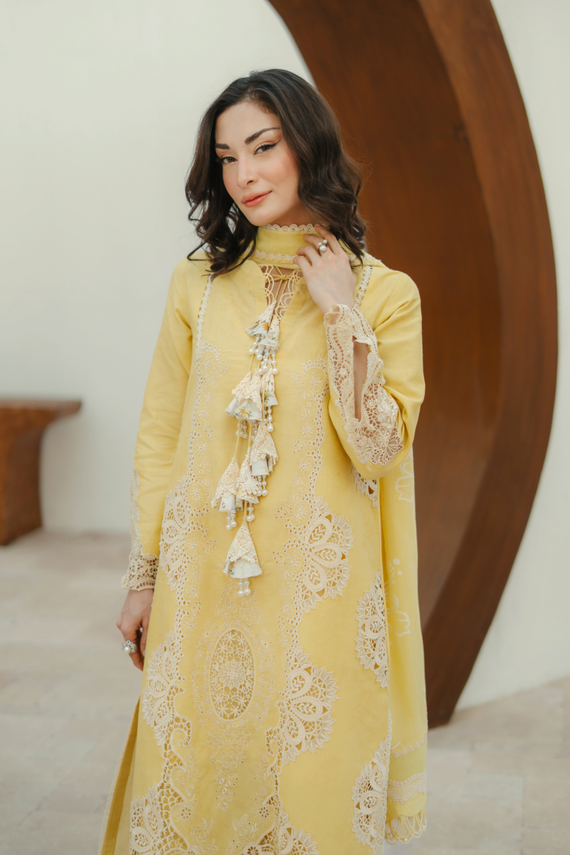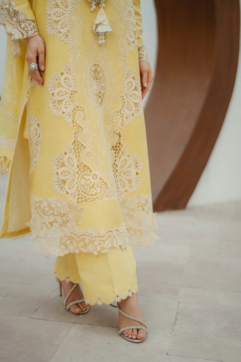 Lilly blooms with the warmth of summer in a cheerful yellow hue on a premium lawn base. The shirt features cream Schiffli cutwork embroideries enhanced with multi-layered beaded tassels and cutwork patches on the hem, and sleeves finished with laces. Perfected with scalloped-edged trousers with lace inserts and a screen-printed floral dupatta, this ensemble is a radiant choice for sunlit summer days.
