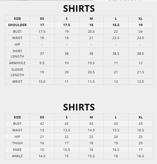 Size charts available in images/ swipe / scroll to the last image to view the size chart.
