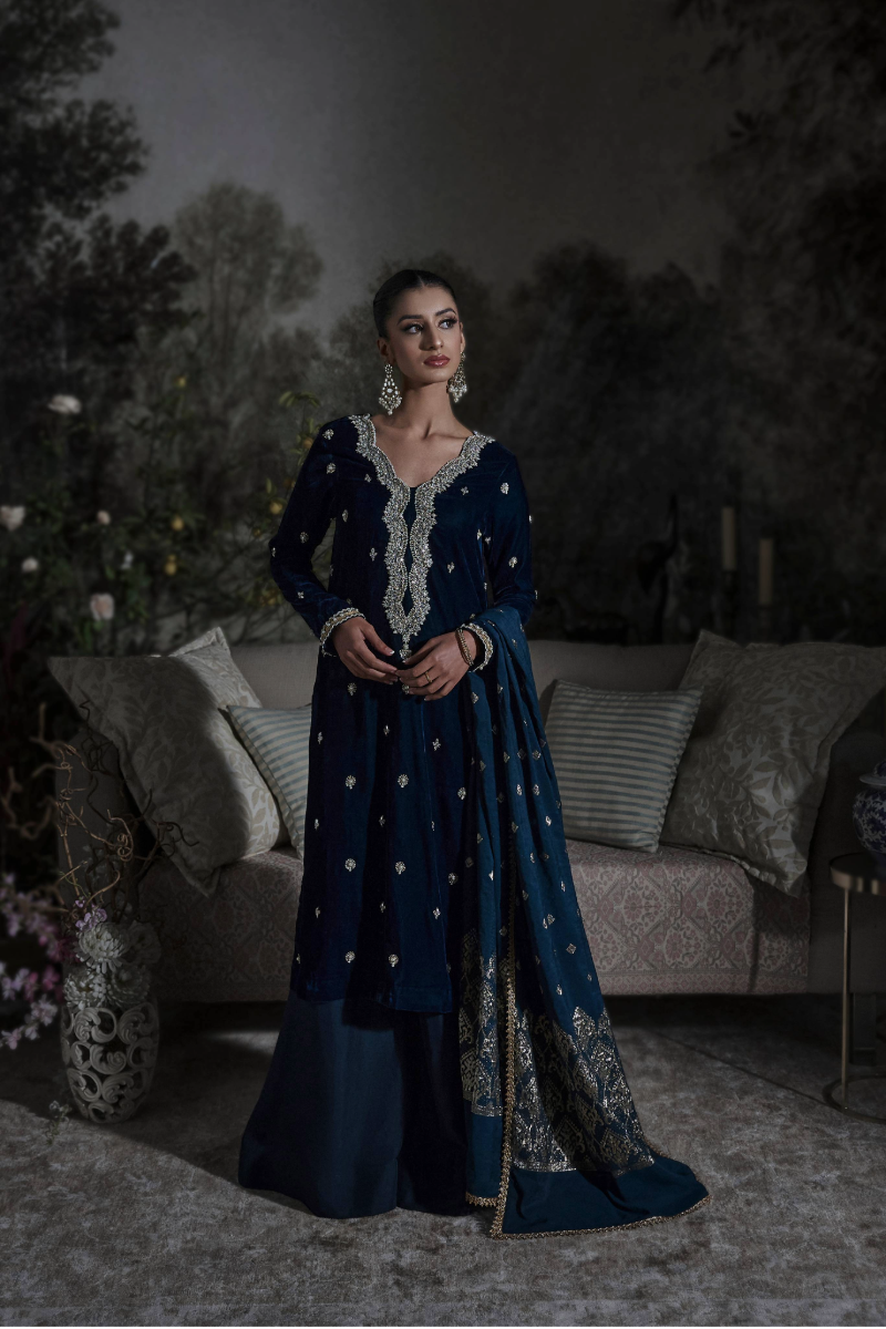 Step into the season with Aurora, a look that effortlessly blends tradition with sophistication for your festive occasions. A beautiful long shirt crafted from premium teal velvet, adorned with pure zari hand embellishments and crystal detailing. Paired with a rich zari gold dupatta and silk izaar pants, Aurora is a timeless choice for anyone who wants to celebrate the season in style.