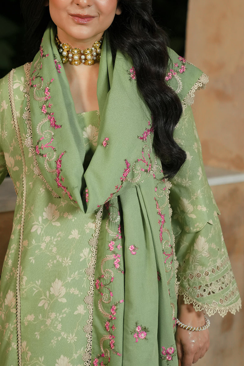 Feminine and unforgettable, "Esra" is a stunning three-piece outfit in pistachio green, crafted on a karandi canvas. The shirt is adorned with schiffli cutwork on the hem and sleeves, paired with matching trousers and a beautifully embroidered dupatta, making it the perfect seasonal outfit.