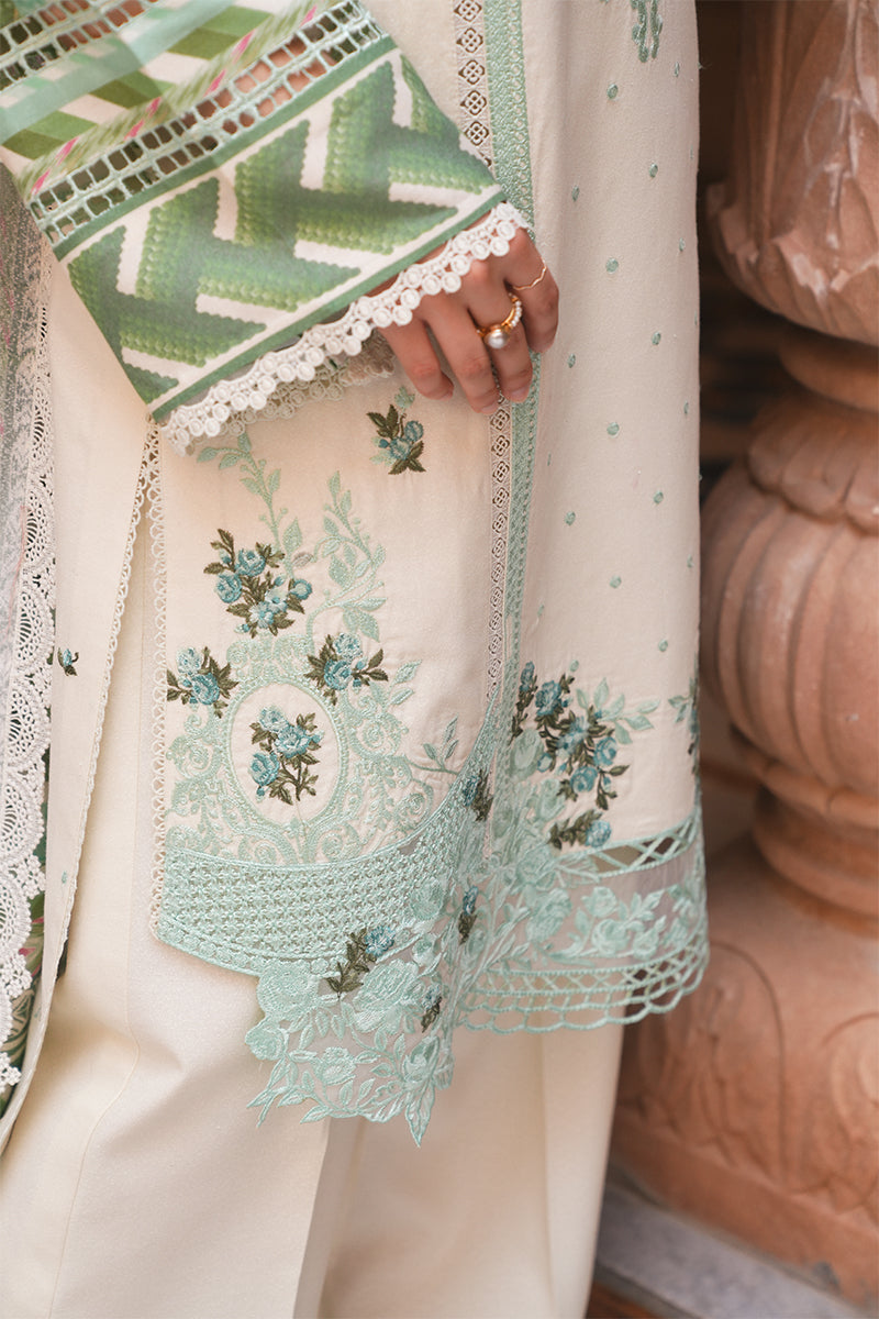 Zircon is the threshold to breezy charm. This off-white, 3-piece Karandi ensemble is embroidered with off-white, green and aqua accents along the neckline, hem, and sleeves. Paired with matching trousers and a floral-printed dupatta, it is a perfect ensemble for a winter sun-downer.
