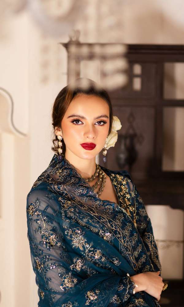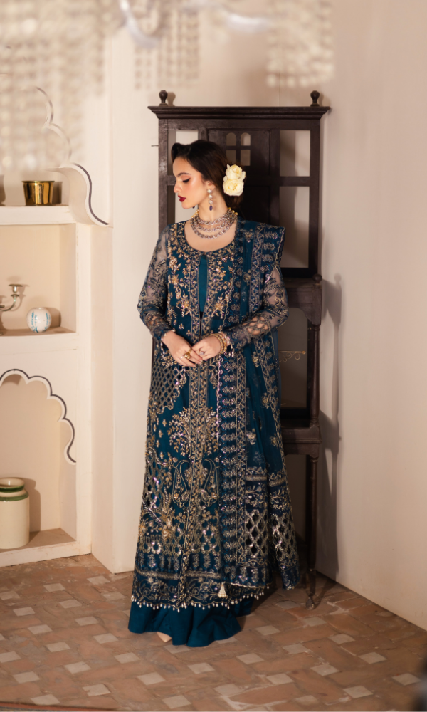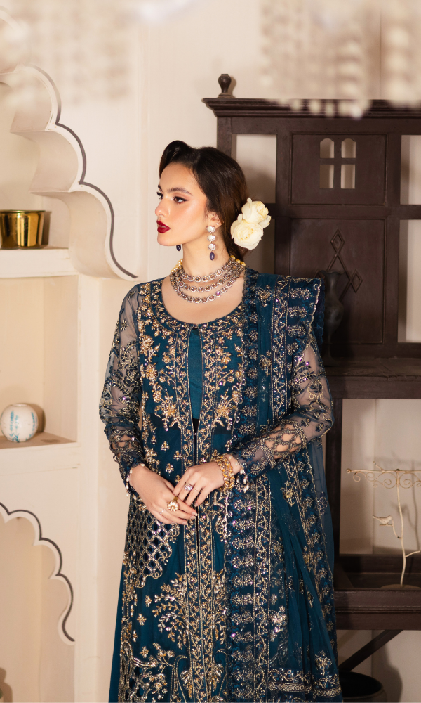 A mesmerizing & net outfit featuring an embroidered front with left and right panels adorned with intricate adda work and hand embellishments. The front also includes patched embroidery with delicate cutwork detailing. The back and sleeves are embroidered, and the inner lining is soft cotton silk for comfort. The trouser is crafted from luxurious raw silk, while the embroidered organza dupatta with a 4-side border adds the perfect finishing touch.