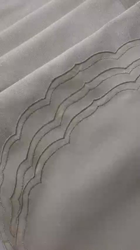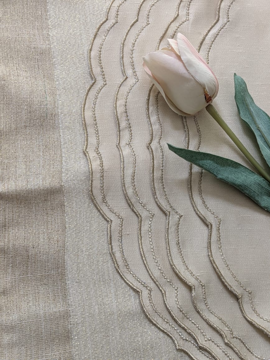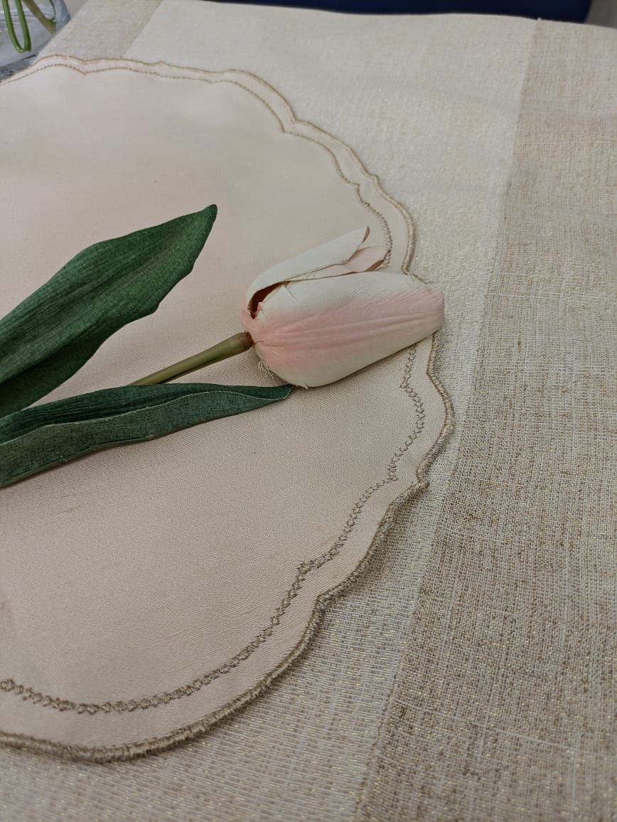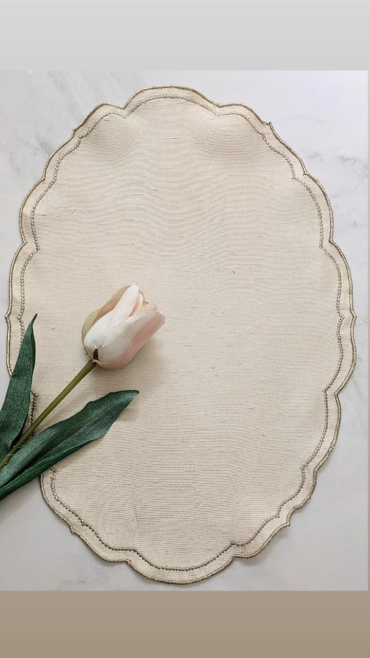 A table runner and placemats set in soft beige and ivory, accented with a subtle hint of gold. The double shaded runner is beautifully woven with golden threads, while the placemats are crafted from raw silk  material and finished with delicate gold embroidered edging. A perfect set for any occasion.