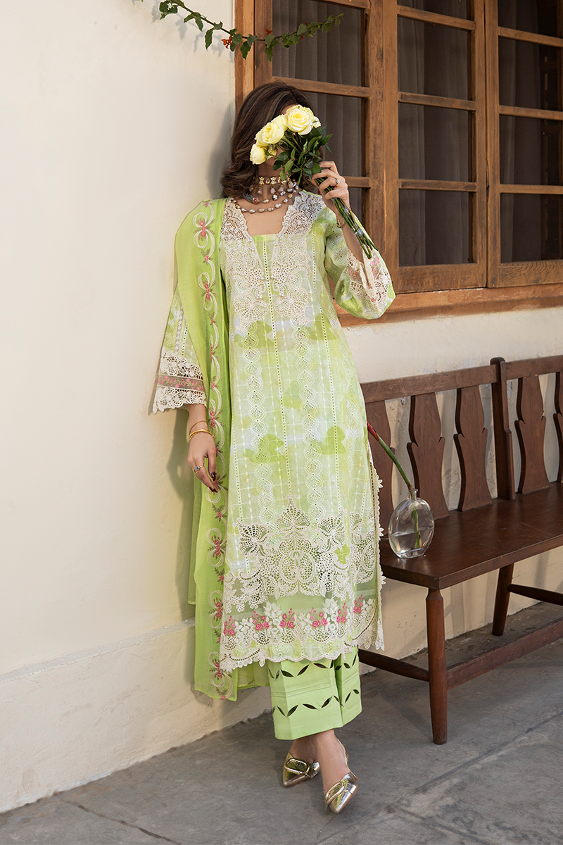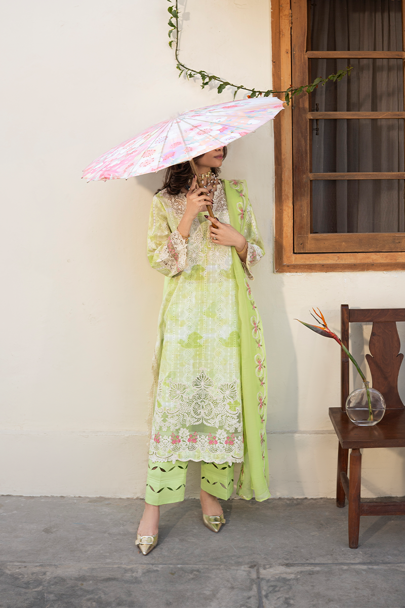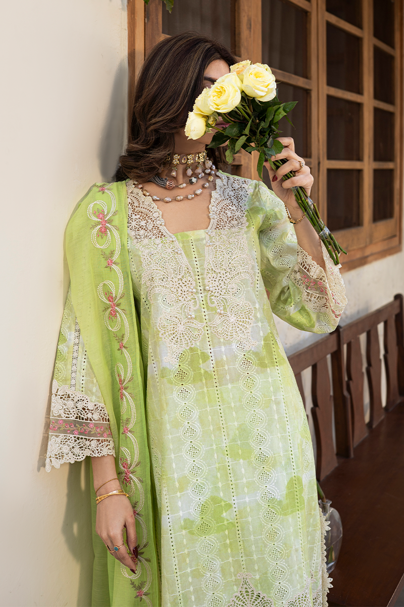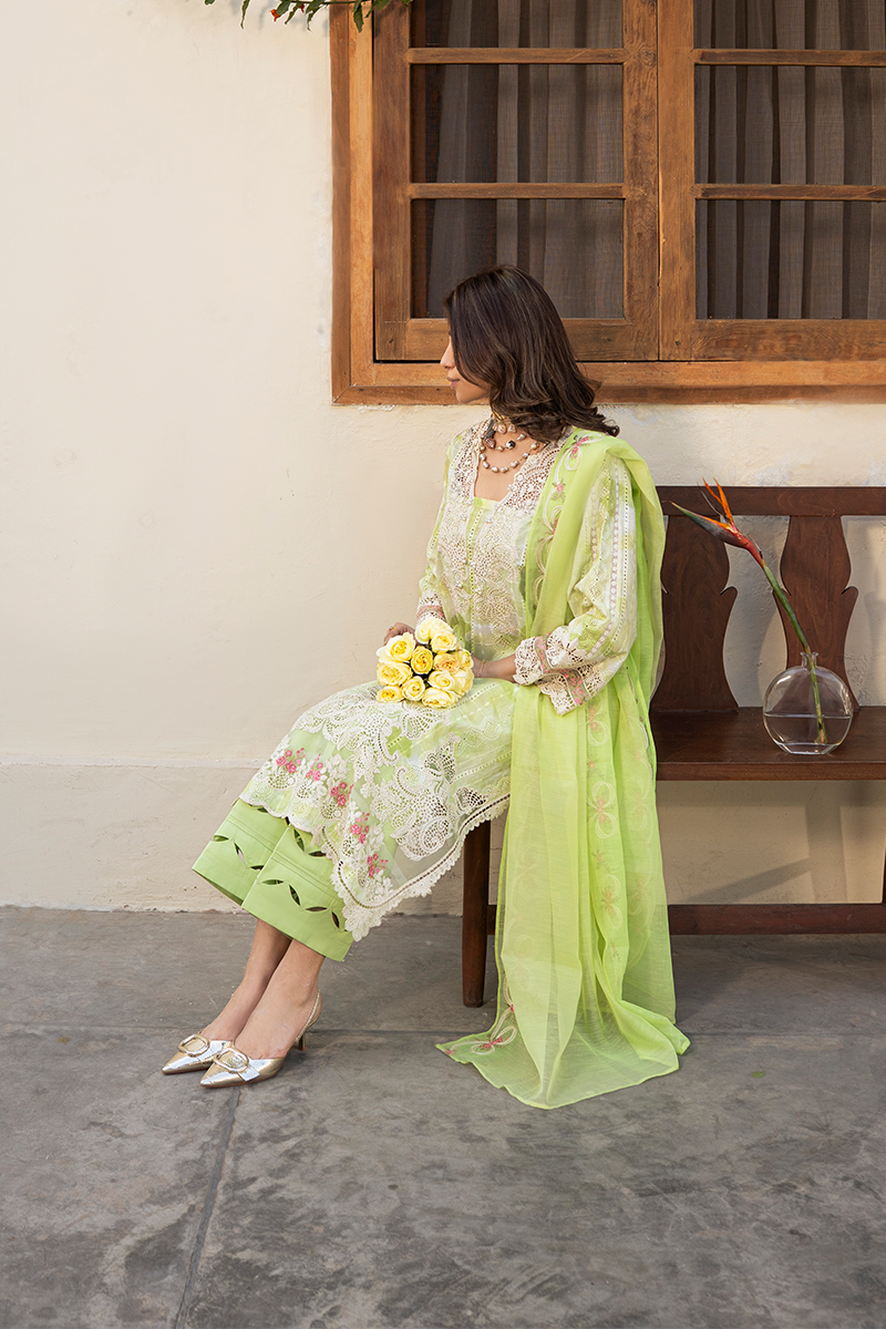 Rendered in a soft pistachio hue, this ensemble is defined by dimensional embroidery layered across a fluid silhouette. Intricate threadwork and finely scalloped borders create depth and structure without overwhelming the design.